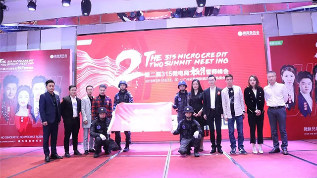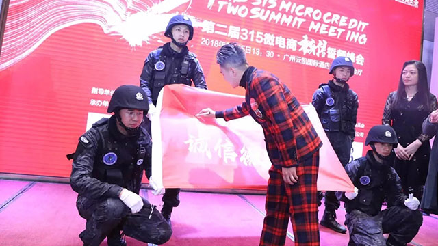 緊接著誓師峰會旗幟由四名特警護送上臺,小越越率先帶領微商各界大咖在旗幟上簽下大名,正式啟動誠信誓師峰會。
