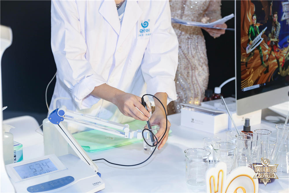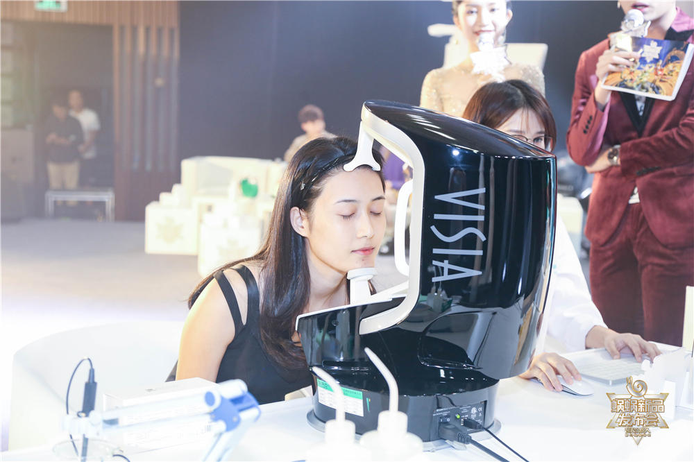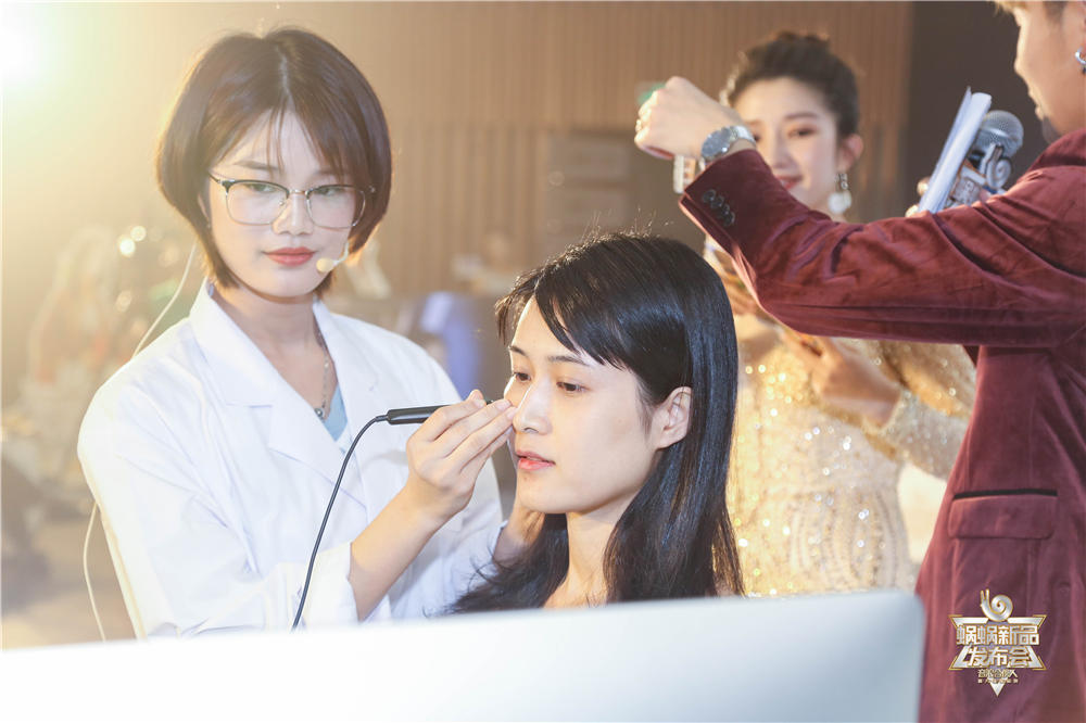 而后,主持人邀請護膚達人上臺進行光子冷凝膠實驗,蝸蝸首次向公眾公布最新研制的光子冷凝膠的成分以及功效。
