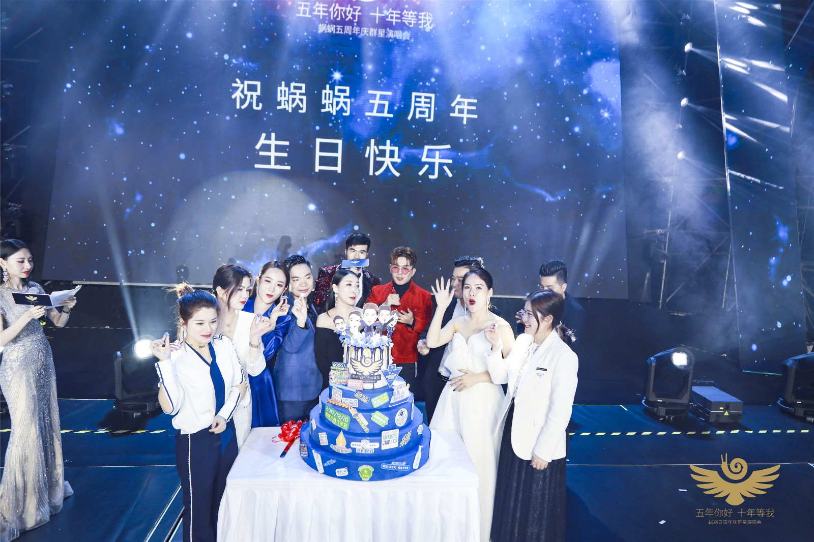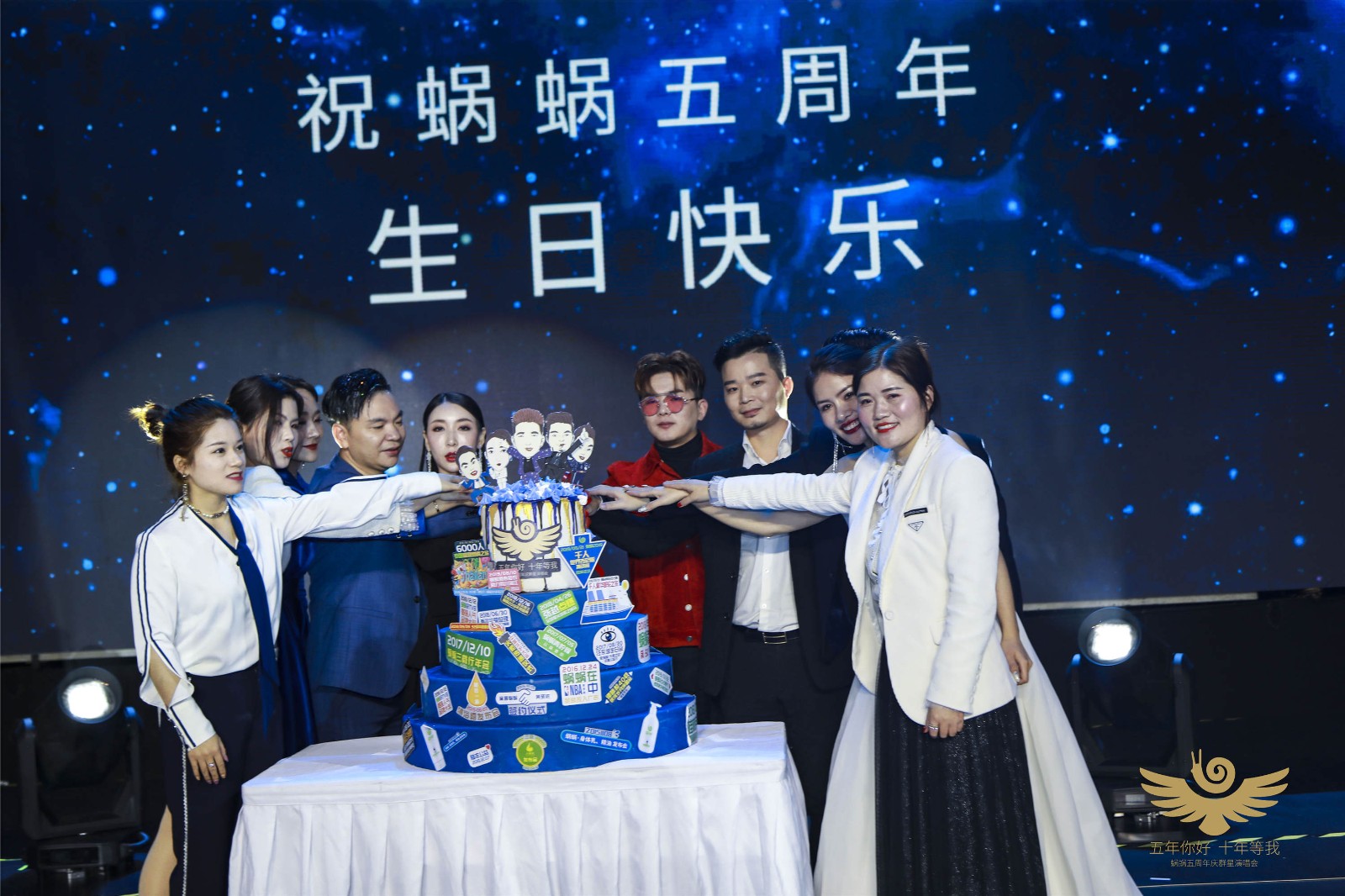 隨著一首清新的音樂,周年慶典專屬蛋糕被緩緩推到舞臺中央,當黛普集團5位股東及核心經銷登臺共切下蛋糕時,蝸蝸五周年慶群星演唱會也落下了帷幕。
